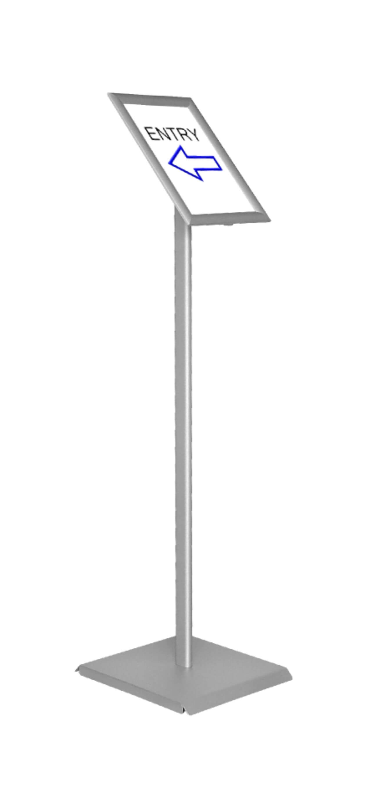 Robuster Informations- Metallständer. Schräge Fläche mit verklappbarem Alurahmen und antireflexive Schutzfolie für schnellen Austausch von Infomaterial. Diese Ständer ist für Technische-, und Preisinformationen sowie Speisekarten, Programm usw. geeignet.