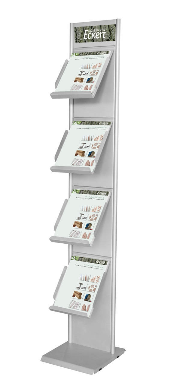 In jedem Ständer können bis zu 8 Prospektfächer (bei doppelseitiger Nutzung) eingesetzt werden. Die Prospektfächer sind DIN A4