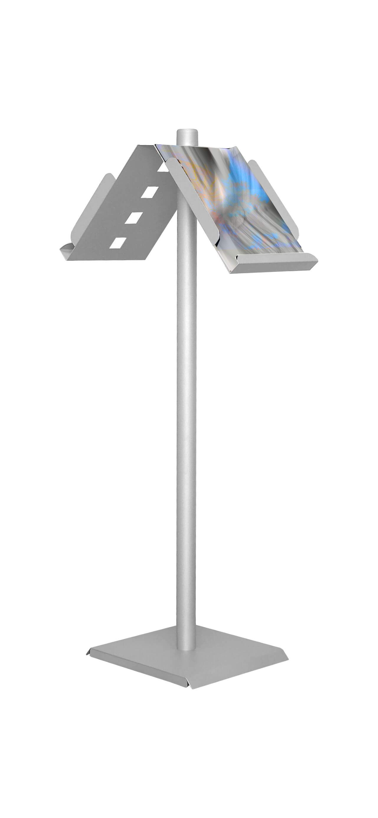 Robuster zweiseitiger Metallständer in silber, schwarz oder weiß, geeignet für die Präsentation von Informationsmaterial .