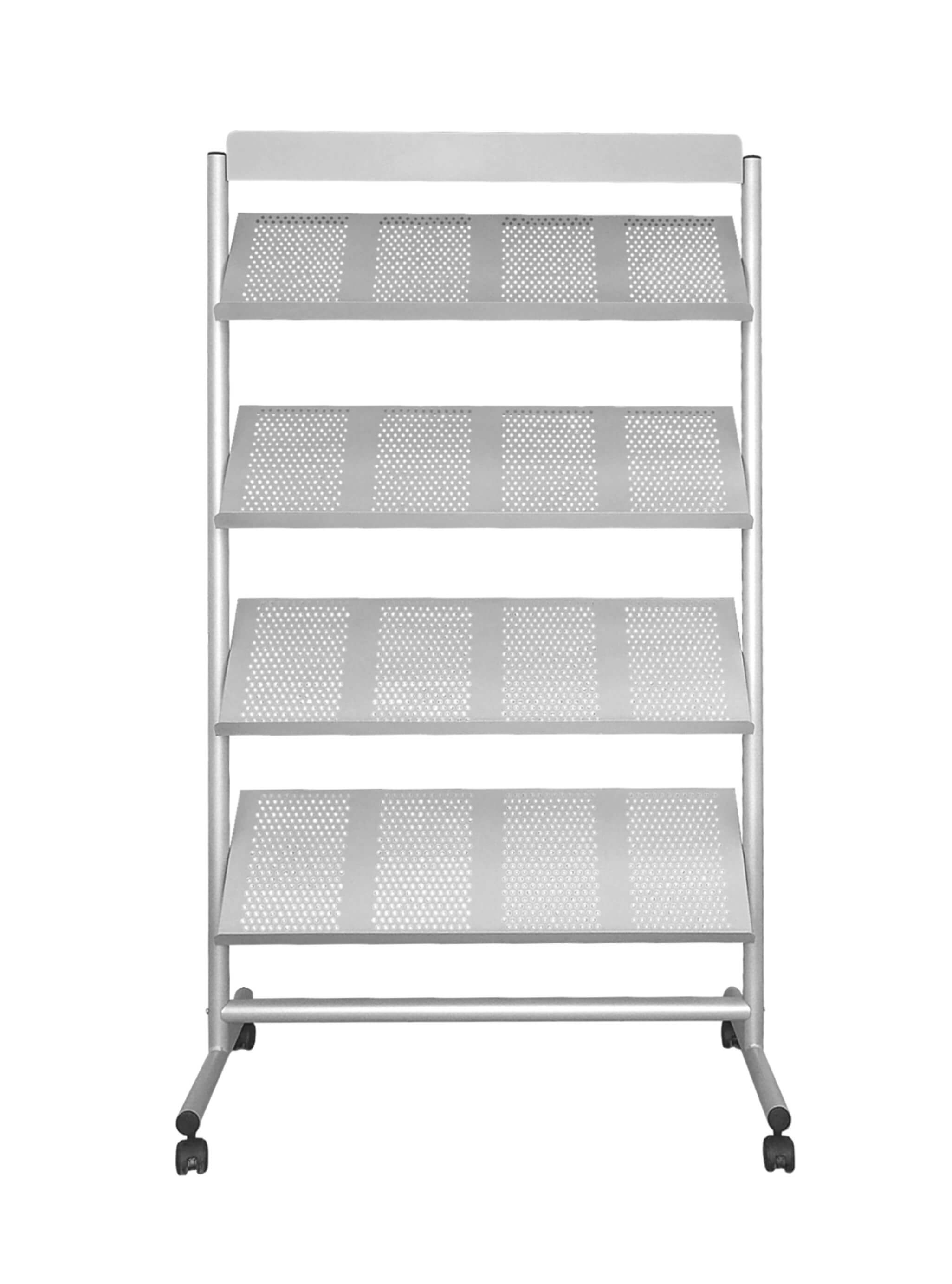 Mobiler Metallständer mit vier Regalböden und einer Querstange für das Firmenlogo. Die Regale sind design perforiert. Die Räder sind mit einer Bremse gegen unbeabsichtige Bewegung ausgestattet.
